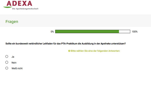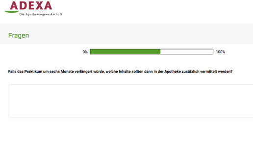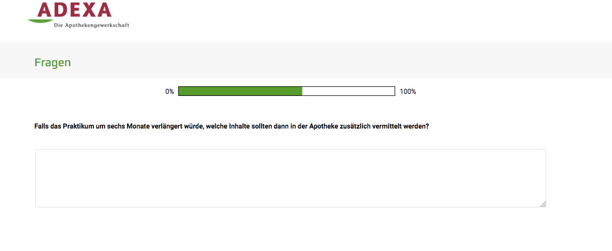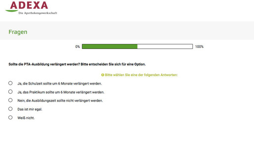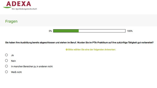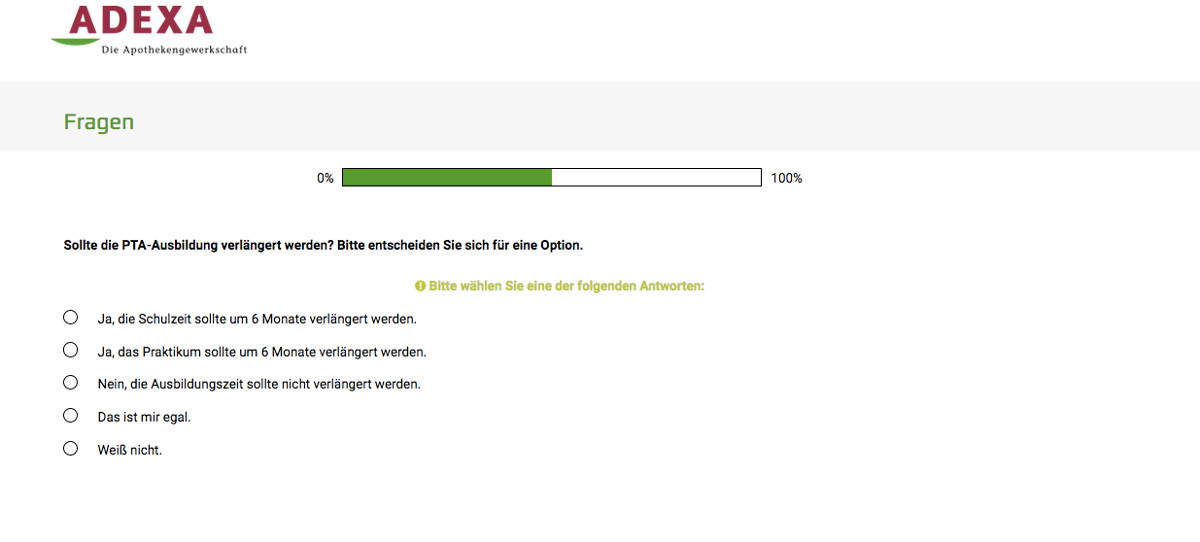 Als erstes will die Gewerkschaft wissen, ob sich der Befragte noch in Ausbildung befindet oder bereits im Berufsleben steht. Hauptaugenmerk legt die Umfrage auf die Ausweitung von Praktikum und Schulzeit. Die Adexa will wissen, wie gut das Praktikum die fertigen PTA auf das Berufsleben vorbereitet hat. Wenn nicht – woran lag es und was kann verbessert werden? Anschließend sollen die Befragten Stellung zur Verlängerung der Ausbildungszeit nehmen. Sollen Praktikum und Schulzeit um jeweils sechs Monate verlängert werden?