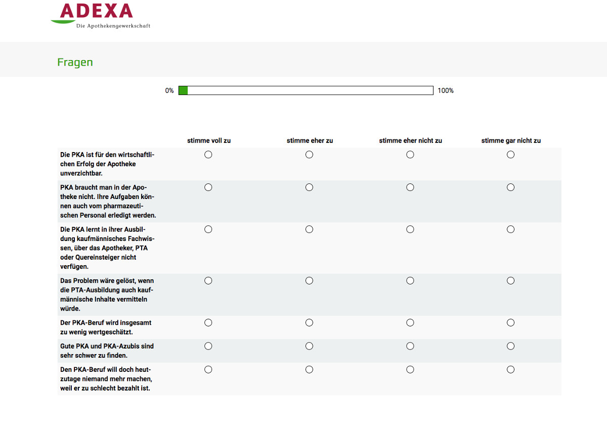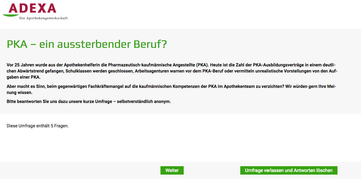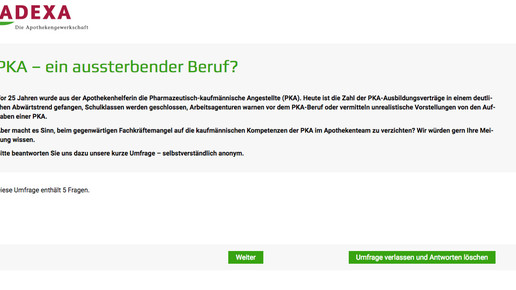 Weil es immer weniger Apothekerhelferinnen gibt, startet die Adexa eine Umfrage zum Thema PKA. Trotz Ausbildungsreform im Jahr 2012 stagnierten die Azubi-Zahlen. Ist ein Apothekenbetrieb auch ohne PKA möglich, will die Gewerkschaft daher wissen. Oder ist die Bezahlung so schlecht?