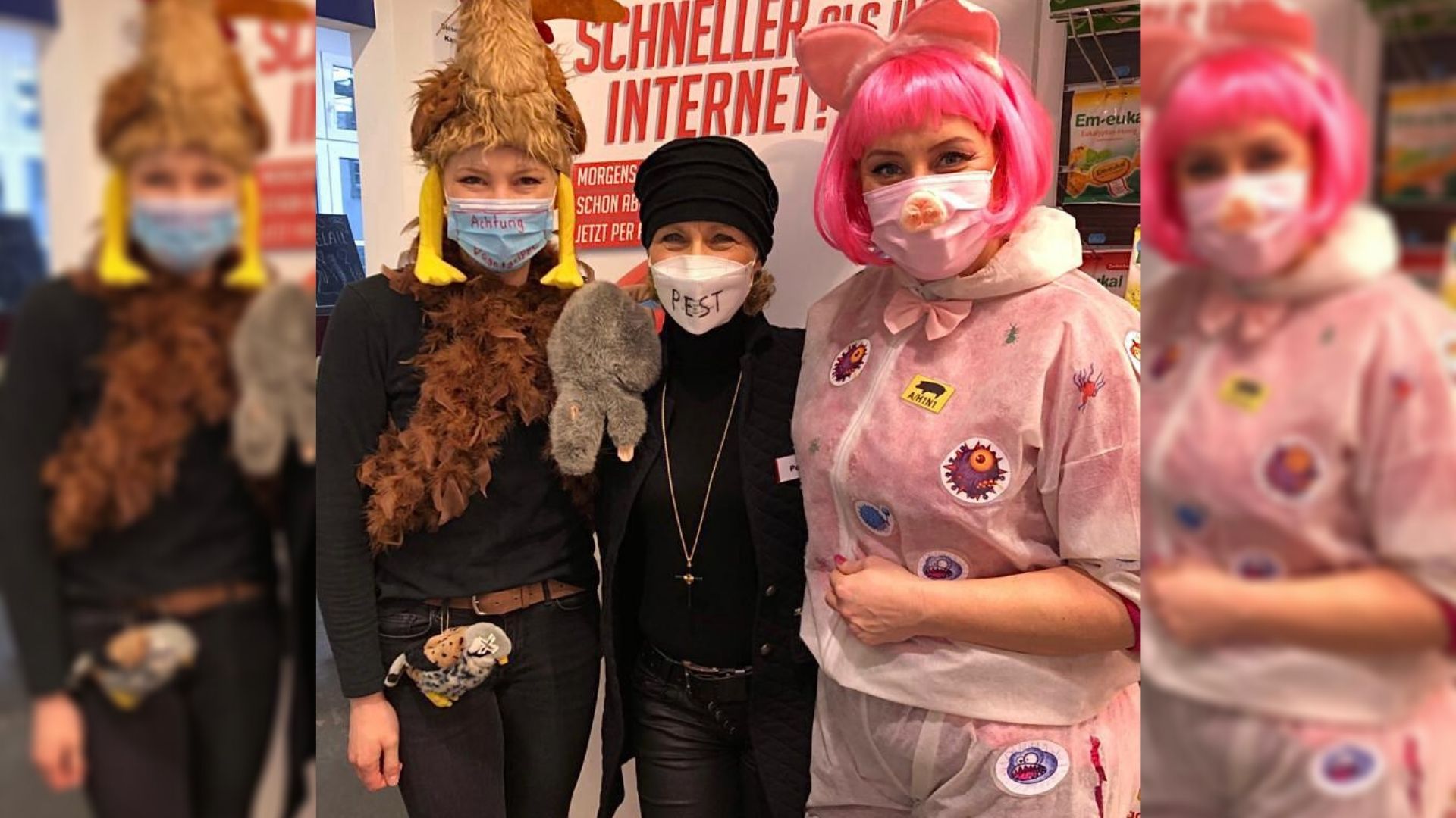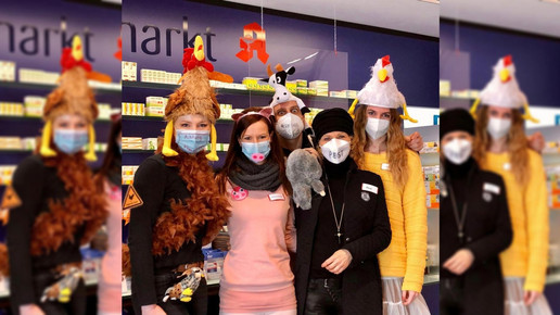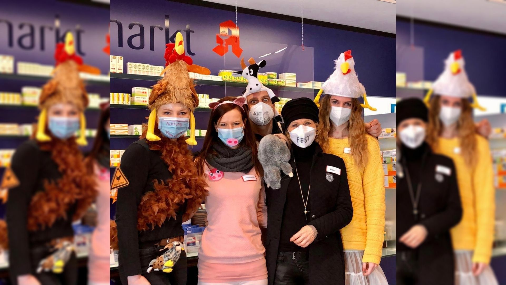 In Arnsberg hat sich das Team der Apotheke am Neumarkt deshalb die Pandemie zum Motto genommen. „Etwas Humor in dieser Zeit muss einfach sein“, meint Apothekerin Imke Jansen. Passend zu Schweine- und Vogelgrippe, BSE und Pest wurde sich als Kuh, Huhn, Schwein und Ratte verkleidet. Positiver Nebeneffekt: „Der Mundschutz integriert sich gut ins Kostüm.“