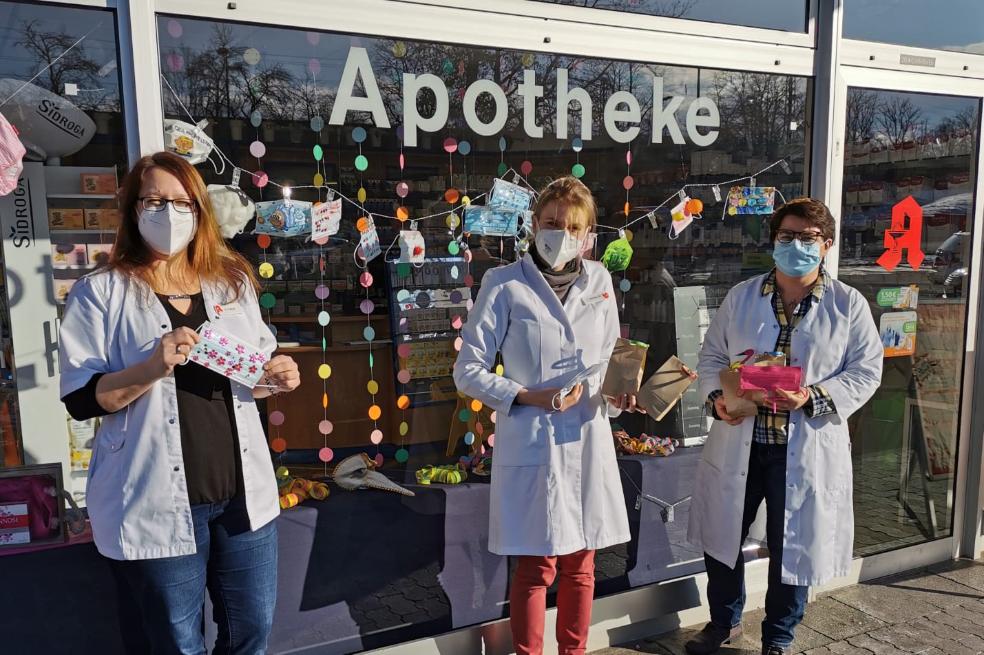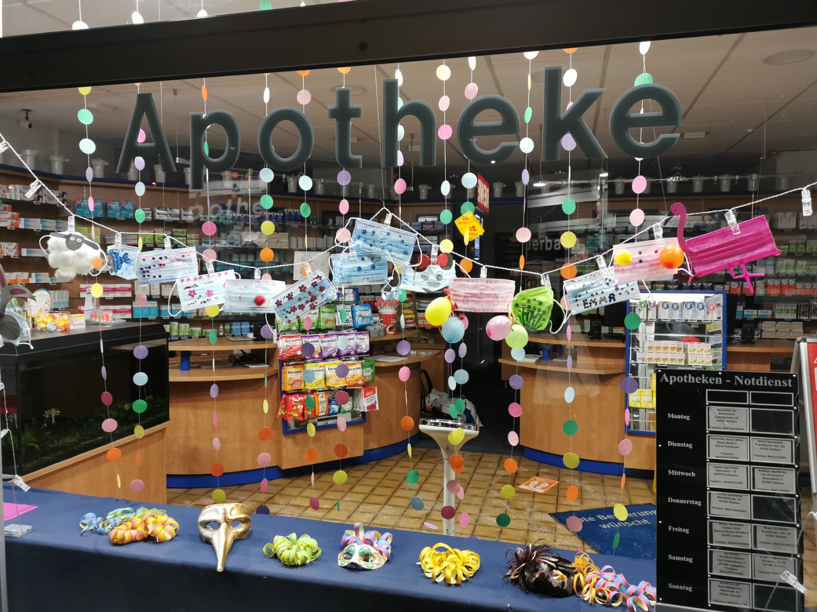 Als kleines Dankeschön erhalten sie eine Tüte mit „Kamelle“ – „denn auch die gibt es in diesem Jahr ja leider nicht“. Die fertiggebastelten Masken wurden dann im Schaufenster der Apotheke aufgehängt – mehr als 20 Stück sind mittlerweile zusammengekommen, bis zum Aschermittwoch werden vermutlich noch einige hinzukommen. „Bei den Kindern kommt die Aktion super an“, meint Faltus. So könne man den Kleinsten zumindest ein wenig Freude bereiten. Sie selbst hofft, dass im nächsten Jahr wieder richtig gefeiert werden kann.