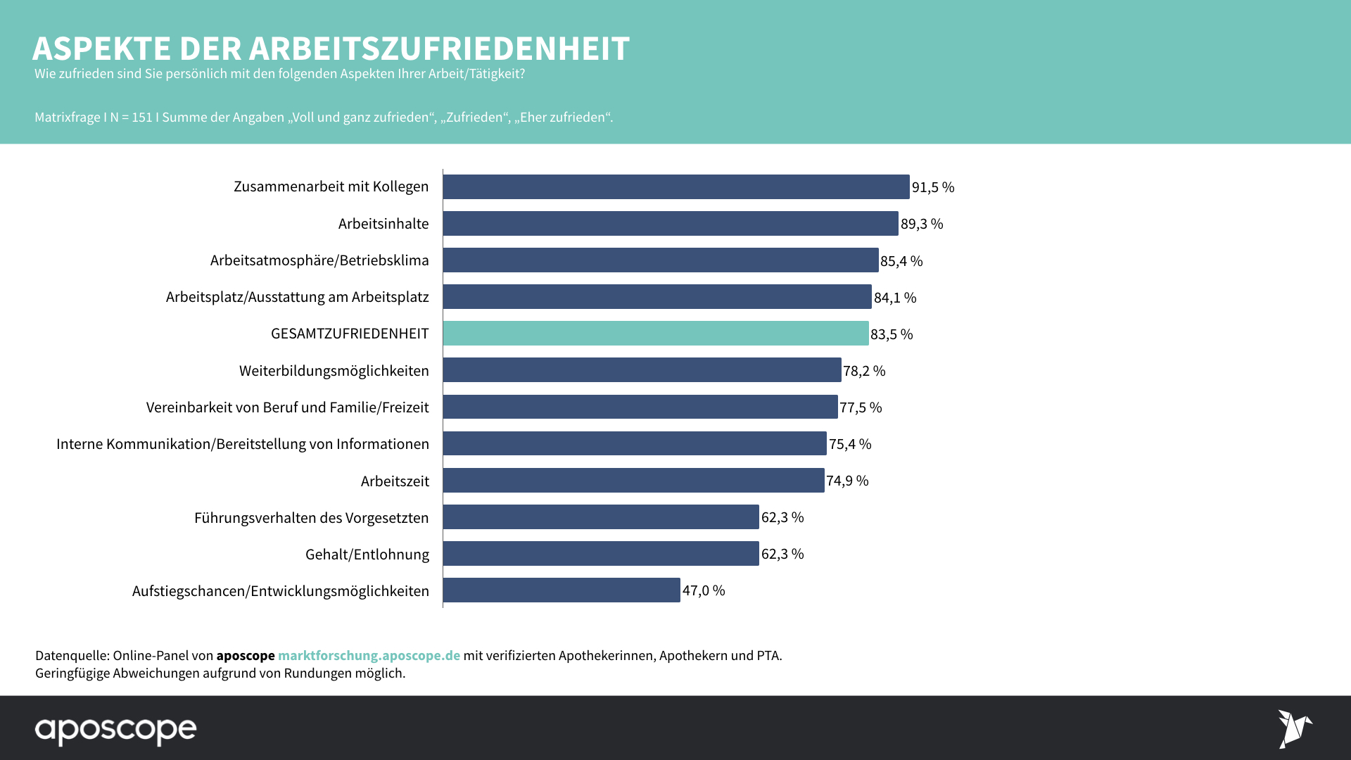 Aber die Apotheke vor Ort hat ihre eigenen Vorzüge: Viele Angestellte schätzen das Arbeiten in einer eingeschworenen Gemeinschaft sowie das Gefühl, Patienten zu helfen. Die Zufriedenheitswerte sind in diesen Bereichen außerordentlich hoch: 85 Prozent mögen die Arbeitsatmosphäre und das Betriebsklima. Und sogar 92 Prozent schätzen den guten Zusammenhalt unter den Kollegen. Mit den Arbeitsinhalten sind 89 Prozent zufrieden, bei den PTA sogar 93 Prozent.