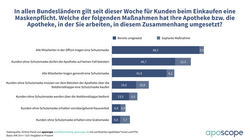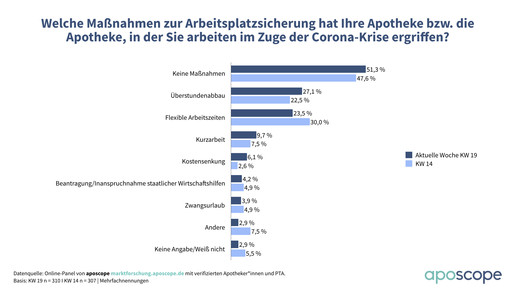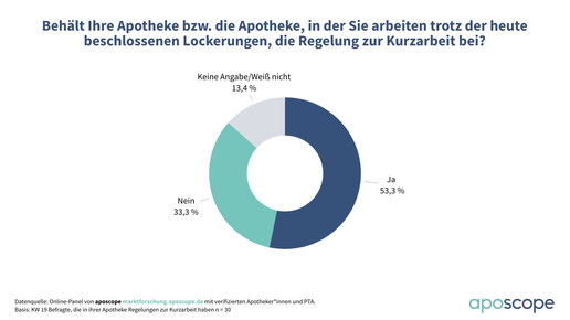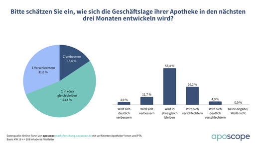 Die Entwicklung der Kundenanzahl dürfte sich auch auf die teilweise angespannte wirtschaftliche Situation der Apotheken auswirken. So gibt jeweils jeder vierte Befragte an, dass in der Offizin derzeit Überstundenabbau (27 Prozent) oder flexible Arbeitszeiten (24 Prozent) greifen, um die Arbeitsplätze zu sichern. Auch Kurzarbeit spielt laut jedem Zehnten eine Rolle. Mit der schrittweisen Rückkehr zur Normalität gehen mehr als zwei Drittel der befragten Apothekeninhaber und Filialleiter (69 Prozent) in den kommenden drei Monaten von einer gleichbleibenden oder verbesserten Geschäftslage aus. Jeder Vierte (26 Prozent) befürchtet allerdings eine Verschlechterung.