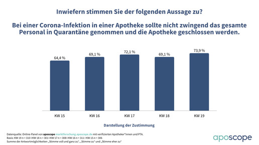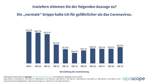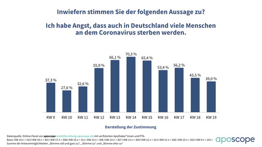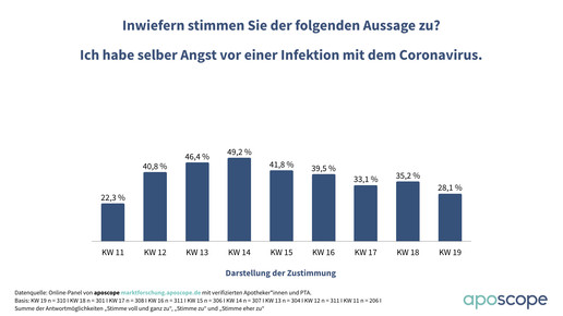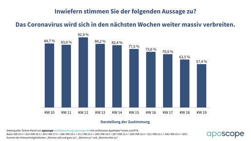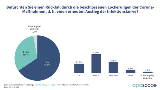Obwohl zwei Drittel der Apotheker und PTA (66 Prozent) durch die beschlossenen Lockerungen einen Anstieg der Infektionskurve befürchten, schwindet die generelle Sorge vor dem Virus sowohl beim Personal als auch bei den Kunden spürbar. So hat die Mehrheit der Befragten (58 Prozent) inzwischen keine Angst mehr davor, dass auch in Deutschland viele Menschen an dem Virus sterben könnten. Vor rund einem Monat war der Anteil nur halb so groß (29 Prozent).