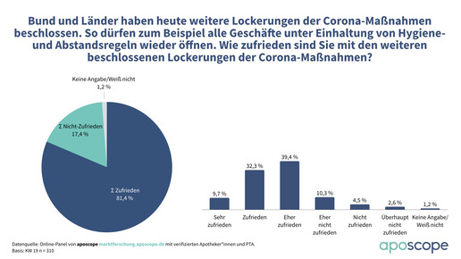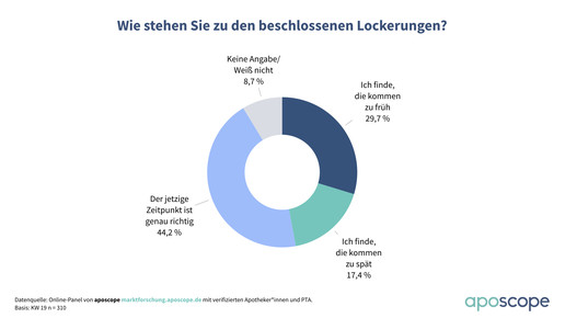 Zwar bleibt die Kontaktsperre grundsätzlich bis zum 5. Juni bestehen, dennoch kehrt die Bundesrepublik schrittweise zur Normalität zurück. Und das ist laut der deutlichen Mehrheit des Apothekenpersonals auch gut so: 81 Prozent der Befragten sind mit den beschlossenen Maßnahmen zufrieden. Zudem kommen für knapp die Hälfte der Umfrageteilnehmer (44 Prozent) die Lockerungen genau zum richtigen Zeitpunkt. Demgegenüber sind 30 Prozent der Meinung, die Maßnahmen kommen zu früh und weitere 17 Prozent glauben, sie kommen zu spät.