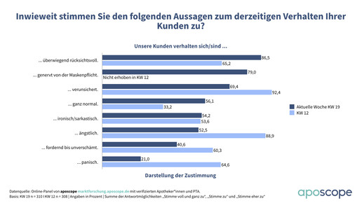 Mehr als die Hälfte der Befragten (56 Prozent) beschreibt das Kundenverhalten mittlerweile als „ganz normal“. Vor sieben Wochen war es lediglich ein Drittel. Und die allermeisten Kunden verhalten sich nach Angaben der Apothekenteams „überwiegend rücksichtsvoll“ (87 Prozent).