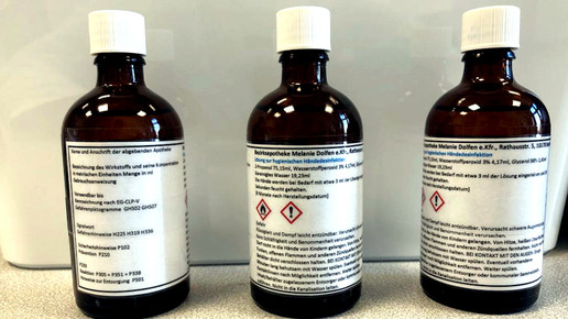 Das eigens hergestellte Desinfektionsmittel wird von den Kunden gut angenommen, die Flaschen der ersten Produktion sind bereits alle verkauft worden, nun wartet Schulz auf die nächste Warenlieferung: „Bislang haben wir 75 Liter Desinfektionsmittel hergestellt, aber das ist noch lange nicht das Ende. Aktuell warten wir auf die neue Rohstoff-Lieferung, dann können wieder über 85 Liter Desinfektionsmittel produziert werden.“ Für den Kunden in der Apotheke wird die Lösung zu 100 ml abgefüllt. Die Beschaffung von Alkohol oder auch Glycerin wird immer schwieriger: „Aktuell schaue ich jeden Tag, wo ich Isopropanol oder auch Glycerin beziehen kann.“ Die Verfügbarkeitsabfragen und telefonischen Anfragen beim Hersteller kosten zusätzlich Zeit.