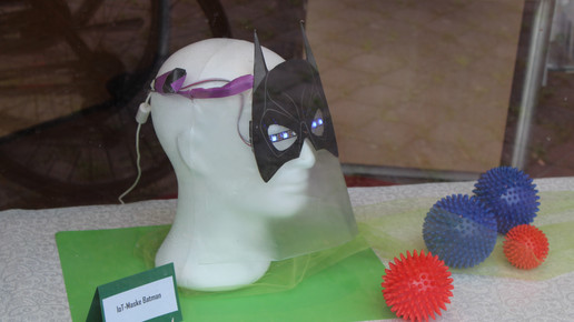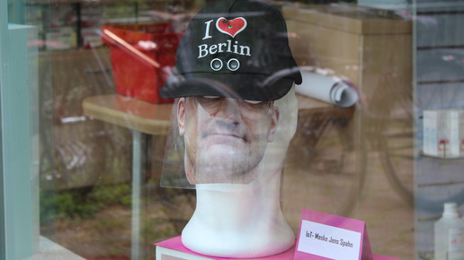 Die Fieberthermometer in der Größe eines Einkaufswagenchips können mittels eines Infrarotsensors die Körpertemperatur schnell und unkompliziert messen. Leuchtet die LED-Lampe grün, besteht kein Grund zur Sorge. Weitere Highlights in den Schaufenstern sind die Faceshields: Neben einem Löwenkopf und einer Batman-Maske ist dort auch das Bild von Gesundheitsminister Jens Spahn mit innovativen Features zu finden. Die Faceshields verfügen ebenfalls über Ultraschall-Abstandsensoren, die anhand von roten und grünen LED-Leuchten anzeigen, ob umgebenden Personen den richtigen Abstand einhalten.