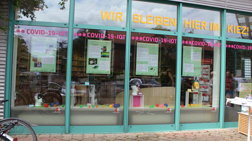 Die Corona-Pandemie war Anlass für die Studierenden im Studiengang Wirtschaftsinformatik der HTW Berlin innovative Produkte zu kreieren. Dabei entstanden Objekte wie der Paxcounter, ein Ultraschall-Abstandssensor, ein Fieberthermometer, interaktive Masken beziehungsweise Faceshields, die helfen, dem Virus auf die Spur zu kommen und sich vor ihm zu schützen. Passend zu jeder Erfindung schmücken Erklärungen zum Aufbau und zur Technologie die Schaufenster der Apotheke.