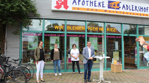 Sybille Witte, die Inhaberin der Apotheke Adlershof, war vom ersten Moment an überzeugt: „Meine Mitarbeiterinnen und ich sind begeistert von den zukunftsorientierten Arbeiten der Studierenden. Wir stellen gerne unsere Schaufenstervitrinen für das Projekt zur Verfügung. Damit können wir unsere Kunden nicht nur für das Thema Corona sensibilisieren, sondern auch von neuen Technologien überzeugen.“
