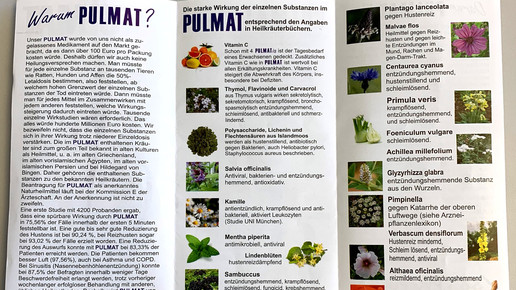 Auf einem anderen Flyer führt der Hersteller noch aus, das Pulmat als Naturheilmittel bei der Kommission E der Ärzteschaft zugelassen werden soll. Der Antrag laufe, an einem Erfolg hat der Hersteller keine Zweifel, schließlich seien die enthaltenden Kräuter schon im alten Griechenland, Ägypten und Persien und bei Hildegard von Bingen bekannt gewesen. „Unser Pulmat wurde von uns nicht als zugelassenes Medikament auf den Markt gebracht, weil es dann über 100 Euro pro Packung kosten würde. Deshalb dürfen wir auch keine Heilversprechen machen“, heißt es auch hier. Man müsse sonst für jede einzelne Substanz an tausenden Tieren wie Ratten, Hunde und Affen die 50-Letaldosis bestimmen. Tausende einzelne Wirkstudien wären erforderlich – und das würde hunderte Millionen Euro kosten. Den Aufwand will man sich offenbar sparen.