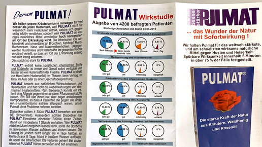 Bei Pulmat handelt es sich um Kräuterbonbons, die es laut einem Radiospot „in jeder guten Apotheke“ gibt. Das Extrakt enthält laut Verpackung knapp zwei Dutzend Substanzen. Einer Studie mit 4200 Probanden – aber ohne weitere Quellenangaben – zufolge scheint es ein echtes Wundermittel zu sein: „Eine gute bis sehr gute Reduzierung des Hustens ist bei 90,24 Prozent, bei Reizhusten sogar bei 93,02 Prozent der Fälle erzielt worden“, heißt es auf einem Flyer. Und so geht es weiter: Reduzierung des Auswurfs (83,33 Prozent) und die Probanden bekommen besser Luft (97,56 Prozent), auch bei Asthma und COPD. Und 87,5 Prozent der Patienten mit Sinusitis seien innerhalb weniger Tage beschwerdefrei gewesen, nachdem zuvor andere Heilmethoden ohne Erfolg geblieben waren.