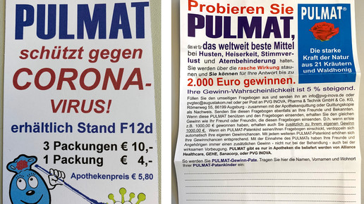 Die Bonbons wurden dagegen zuletzt schon auf der Gesundheitsmesse „Franken aktiv & vital“ feilgeboten, die Anfang März in Bamberg noch veranstaltet wurde: Auf einem Flyer hieß es: „Pulmat schützt gegen Corona-Virus“. Eine Packung wurde an Stand F12d für 4 Euro angeboten, der 3er-Pack zu 10 Euro. Als Referenz wurde der „Apothekenpreis“ mit 5,80 Euro angegeben. Nach Angaben des Herstellers ist das Produkt aber nur in Apotheken erhältlich, die von Alliance Healthcare, Gehe oder direkt von PVG Inova beliefert werden. Auf einem Flyer wirbt der Hersteller sogar mit den Logos der Großhändler und der dazugehörenden Apothekenkooperationen.
