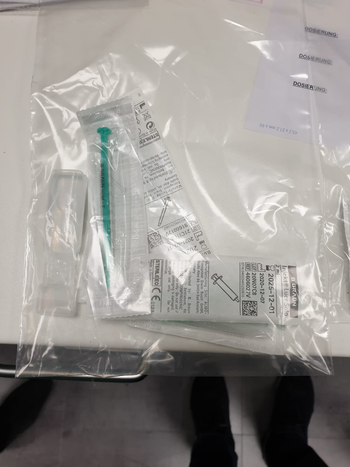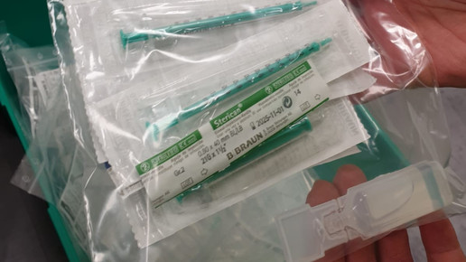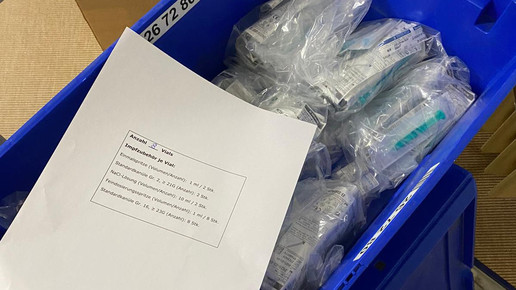 Auch sie griff zum Hörer und erkundigte sich beim Großhändler– und erhielt ebenfalls keine klare Auskunft. „Phoenix konnte es uns nicht sagen, woran es liegt. Bei denen ist wahrscheinlich auch grad landunter.“ Immerhin war das Zubehör entsprechend der bestellten Impfstoffmenge korrekt und richtig abgepackt – das war bekanntlich auch nicht überall so: Für vier Vials erhielt sie vier einzeln verpackte Zubehörsets mit einer Ampulle NaCl-Lösung und einer Kanüle sowie sechs Feindosierungsspritzen.