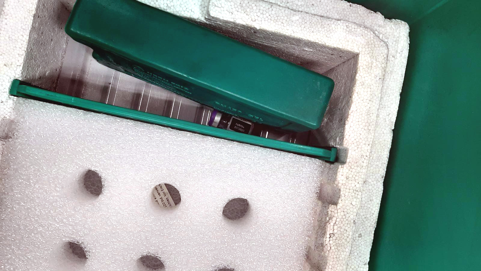 Der Corona-Impfstoff soll möglichst ohne Erschütterung transportiert werden. Die Großhändler benutzen meist Schaumstoff in den Kühlboxen, der das kostbare Gut aufrecht hält und schützt. So kamen die Vials auch in der Turm-Apotheke an – eben mit einer Ausnahme. Ein Fläschchen lag neben dem Schaumstoff in der Wanne.