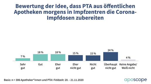 Grundsätzlich finden 71 Prozent der Apotheker und PTA den Ansatz positiv, dass die Corona-Massenimpfungen in eigens eingerichteten Impfzentren durchgeführt werden sollen. Die Idee, dass PTA aus öffentlichen Apotheken dort morgens den Impfstoff aus der Ampulle aufziehen, mit Kochsalzlösung vermischen und so die Impfdosen fertig zur Abgabe machen, sehen zwar 54 Prozent skeptisch. Doch immerhin 43 Prozent bewerten den Vorschlag positiv – wobei dieser Wert ausgerechnet in der Gruppe der PTA mit 36 Prozent etwas niedriger liegt.