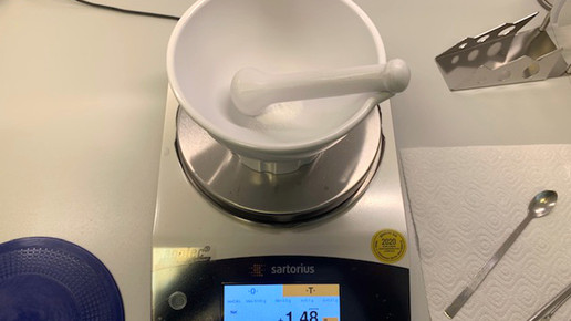 Der Rezeptar kann 0,1g Eisenoxid abwiegen und in eine Fantaschale überführen. Generell ist der Versuch mit jedem farbigen, nicht-toxischen Wirkstoff möglich. Hinzu wird ein Gramm Füllmittel gewogen. Dann wird homogenisiert. Danach erfolgt die Zugabe des restlichen Füllmittels. Aufgrund des farblichen Anteils hat der Rezeptar eine optische Kontrolle, wie lange er persönlich homogenisieren muss, bis ein farblich einheitliches Pulver vorliegt. Gerade für Praktikanten stellt dieser Selbstversuch eine gute Art dar, ein Gefühl für Reibschale & Co. zu erhalten.