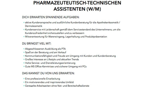 Die PTA sollen Mitverantwortung für den Wareneingang, die Lagerhaltung und die Präsentation der Produkte tragen. Douglas verlangt von den Interessenten eine aktive Kundenansprache und eine ausführliche Beratung zu Apotheken- und Dermokosmetik. Die Parfümeriekette will PTA mit „geregelten Arbeitszeiten ohne Not- und Bereitschaftsdienste“ locken. Interessenten sollen sich mit Angabe der Gehaltsvorstellung melden. Gesucht wird ab August in Voll- und Teilzeit. „Wir freuen uns auf Dich!“, endet das Stellenangebot.