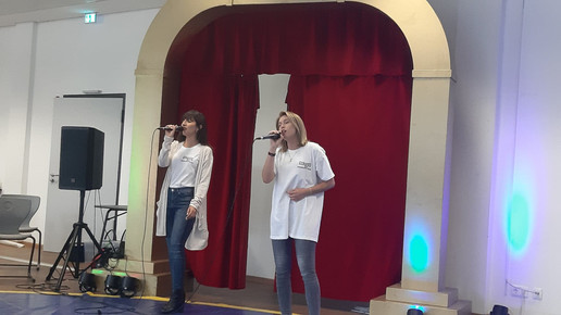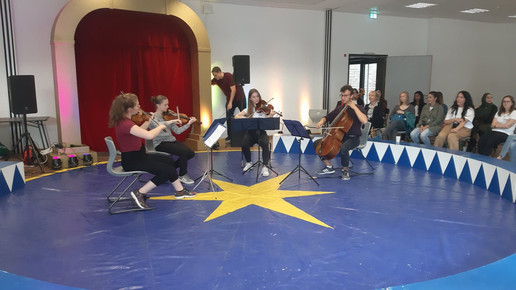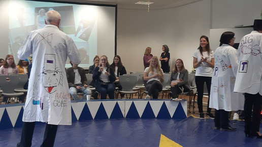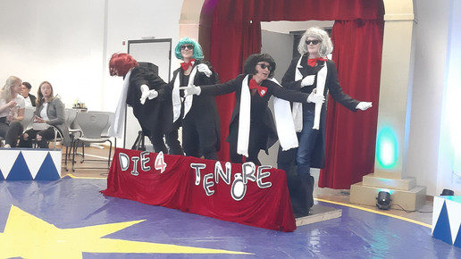 Einige der Schüler zeigten sich von ihrer musikalischen Seite: Neben einem Streichquartett gab es zwei Gesangsduos, die das Programm füllten. Ein Highlight waren auch „Die vier Tenöre“: Ein Quartett aus Kollegen der Lehranstalt, welches eine lustige Darstellung bot und dafür vom Publikum gefeiert wurde. Ebenso wurde das Kollegium in die Kittelschau eingebunden: Die Schüler hatten im Vorfeld spezielle Kittel – passend zu den Fächern der Lehrkräfte – gestaltet. „Wir duften sie vorher nicht sehen, das war bis zum Schluss geheim“, erklärt Bettina Castenholz, Dozentin an der Lehrakademie.
