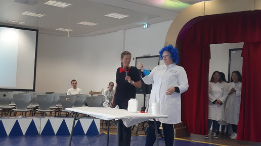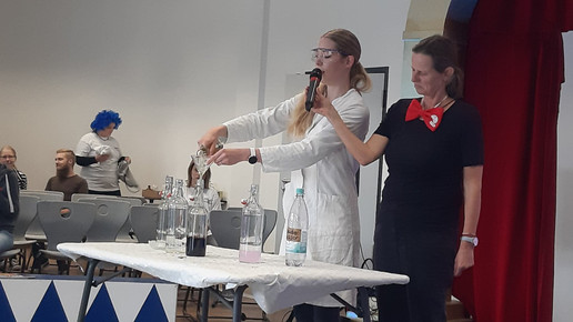 Klassische und unterhaltsame Experimente aus der Chemie durften natürlich ebenfalls nicht fehlen: Unter dem Namen „Zauber der Chemie“ wurde unter Zugabe verschiedener „Zauberwasser“ und „Feenstaub“ unter anderem Elefantenzahnpasta hergestellt, ein Vulkan gezündet und verschiedene Weine hergestellt. Hußmann erklärte außerdem, welche Dinge in diesem Jahr ebenfalls ihren 50. Geburtstag feiern: Die beliebten Tic Tac Bonbons, Capri-Sonne, das Internet und der Geldautomat werden ebenfalls 50 Jahre alt. Glückwünsche gab es auch von anderen PTA-Schulen: Katrin Cremer, Schulleiterin der PTA Lehranstalt der Region Aachen in Baesweiler und Andrea Niehoff-Ströh, Schulleiterin der PTA-Schule in Solingen, überbrachten ihre guten Wünsche.