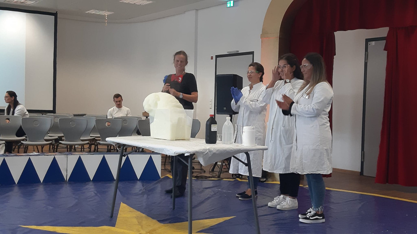 Klassische und unterhaltsame Experimente aus der Chemie durften natürlich ebenfalls nicht fehlen: Unter dem Namen „Zauber der Chemie“ wurde unter Zugabe verschiedener „Zauberwasser“ und „Feenstaub“ unter anderem Elefantenzahnpasta hergestellt, ein Vulkan gezündet und verschiedene Weine hergestellt. Hußmann erklärte außerdem, welche Dinge in diesem Jahr ebenfalls ihren 50. Geburtstag feiern: Die beliebten Tic Tac Bonbons, Capri-Sonne, das Internet und der Geldautomat werden ebenfalls 50 Jahre alt. Glückwünsche gab es auch von anderen PTA-Schulen: Katrin Cremer, Schulleiterin der PTA Lehranstalt der Region Aachen in Baesweiler und Andrea Niehoff-Ströh, Schulleiterin der PTA-Schule in Solingen, überbrachten ihre guten Wünsche.