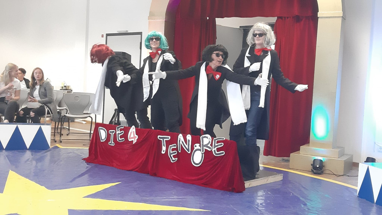 Einige der Schüler zeigten sich von ihrer musikalischen Seite: Neben einem Streichquartett gab es zwei Gesangsduos, die das Programm füllten. Ein Highlight waren auch „Die vier Tenöre“: Ein Quartett aus Kollegen der Lehranstalt, welches eine lustige Darstellung bot und dafür vom Publikum gefeiert wurde. Ebenso wurde das Kollegium in die Kittelschau eingebunden: Die Schüler hatten im Vorfeld spezielle Kittel – passend zu den Fächern der Lehrkräfte – gestaltet. „Wir duften sie vorher nicht sehen, das war bis zum Schluss geheim“, erklärt Bettina Castenholz, Dozentin an der Lehrakademie.
