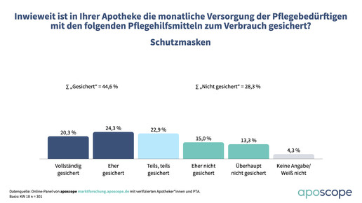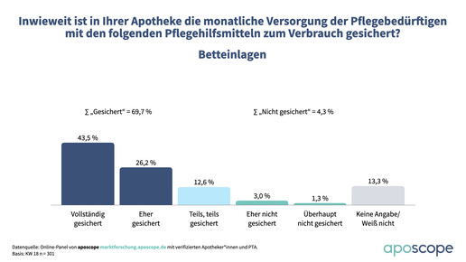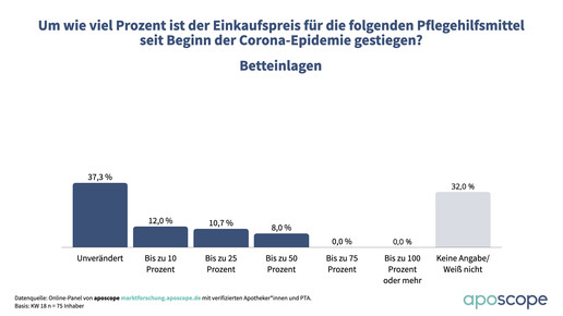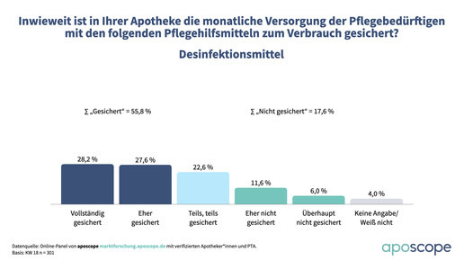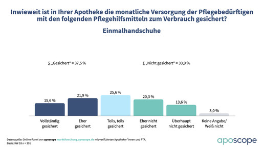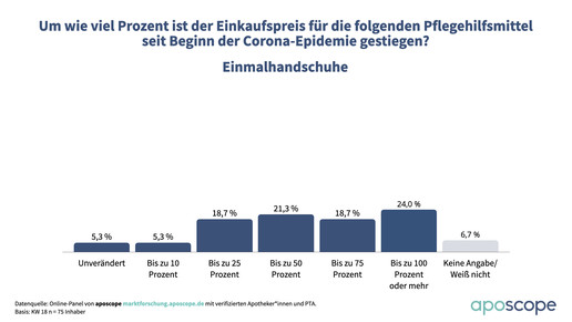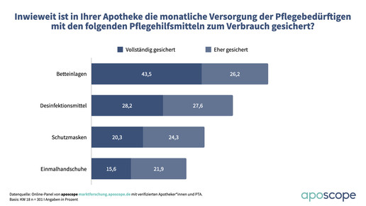 Derzeit wird über eine höhere Kassenpauschale für Pflegehilfsmittel diskutiert, die Pflegende benötigen, um betroffene Angehörige zu Hause zu pflegen. Dazu gehören Produkte wie Betteinlagen, Einmalhandschuhe, sowie Desinfektionsmittel und Schutzmasken, die aktuell zum Teil verstärkt nachgefragt werden. Während die Versorgung mit entsprechenden Produkten bis auf Einmalhandschuhe in den Apotheken überwiegend gesichert ist, ist mit Ausnahme von Betteinlagen bei allen Pflegehilfsmitteln ein Anstieg des Einkaufspreises festzustellen.