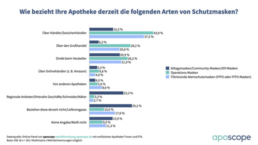 Sowohl Filtrierende Masken als auch OP-Masken bezieht das Apothekenpersonal dabei vor allem über Händler oder Zwischenhändler (38 Prozent und 44 Prozent). Aber auch der Großhandel sowie der direkte Bezug vom Hersteller spielen bei rund jedem Vierten (OP-Masken) beziehungsweise jedem fünften Befragten (FFP2 und FFP3) eine Rolle.