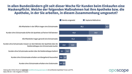 Um die Übertragung des Virus einzudämmen, haben inzwischen alle Bundesländer eine Maskenpflicht eingeführt, die sowohl im öffentlichen Nahverkehr als auch beim Einkaufen gilt – das betrifft auch Apotheken. Kunden müssen beim Betreten der Apotheke eine Maske tragen, bei Nichteinhaltung droht je nach Bundesland ein Bußgeld.
