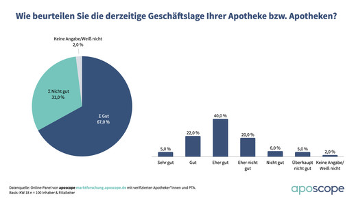 Nach einem Kundenansturm in den ersten Wochen der Corona-Pandemie sind die Kundenzahlen in vielen Apotheken zuletzt eingebrochen, sodass vielerorts Überstunden abgebaut oder sogar Kurzarbeit angemeldet werden musste. Somit wuchs auch die Sorge um das wirtschaftliche Überleben der Offizin und den eigenen Arbeitsplatz. Dennoch beurteilen zwei Drittel (67 Prozent) des Apothekenpersonals die derzeitige Geschäftslage ihrer Apotheke als sehr gut bis eher gut.