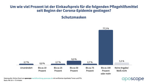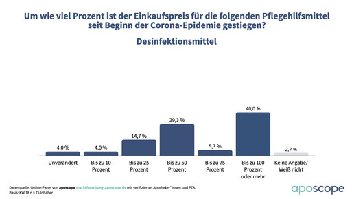 Besonders betroffen sind davon Schutzmasken, für die laut mehr als drei Viertel der befragten Inhaber (77 Prozent) ein Aufschlag von 100 Prozent oder mehr fällig wird. 30 Prozent der Inhaber berichten, dass der Einkaufspreis von Desinfektionsmitteln seit Beginn der Corona-Epidemie um bis zu 50 Prozent gestiegen ist, laut 40 Prozent sogar um 100 Prozent oder mehr.