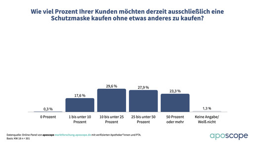 Bereits vor der bundesweiten Maskenpflicht war die Nachfrage nach Schutzmasken und Mund-Nasen-Bedeckungen hoch. Diese hält auch weiterhin an. Laut einem Viertel der Befragten (28 Prozent) kommen etwa 25 bis 50 Prozent der Kunden nur in die Offizin, um eine Maske zu kaufen. Bereits in der vergangenen Woche gab die deutliche Mehrheit der Befragten (83 Prozent) an, in der Offizin wieder einen Vorrat an Masken zum Verkauf zu haben. 70 Prozent der Apotheken haben derzeit sogar die lange Zeit ausverkauften Filtrierenden Atemmasken (FFP2 und FFP3) vorrätig. OP-Masken sind sogar in 82 Prozent der Apotheken vorhanden. Dagegen ist der Vorrat an Alltags- oder Community-Masken in Apotheken eher gering (48 Prozent).