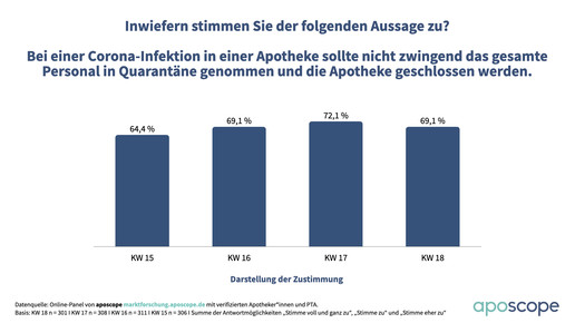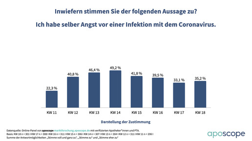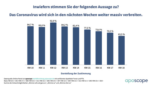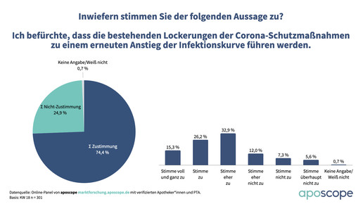 Seit Beginn vergangener Woche sind erste Lockerungen der Corona-Regelungen in Kraft, die nach wochenlanger Schließung vor allem im Einzelhandel für Aufatmen gesorgt haben. Sowohl die Bundesregierung als auch Virologen haben jedoch eindringlich davor gewarnt, dass durch diesen ersten Schritt zurück in die Normalität die Zahl der Corona-Erkrankungen wieder steigen könnte. Diese Sorge teilen knapp drei Viertel der Umfrageteilnehmer. Sollte es demnächst noch weitere Lockerungen geben, ist die Besorgnis beim Apothekenpersonal sogar noch etwas größer (78 Prozent).