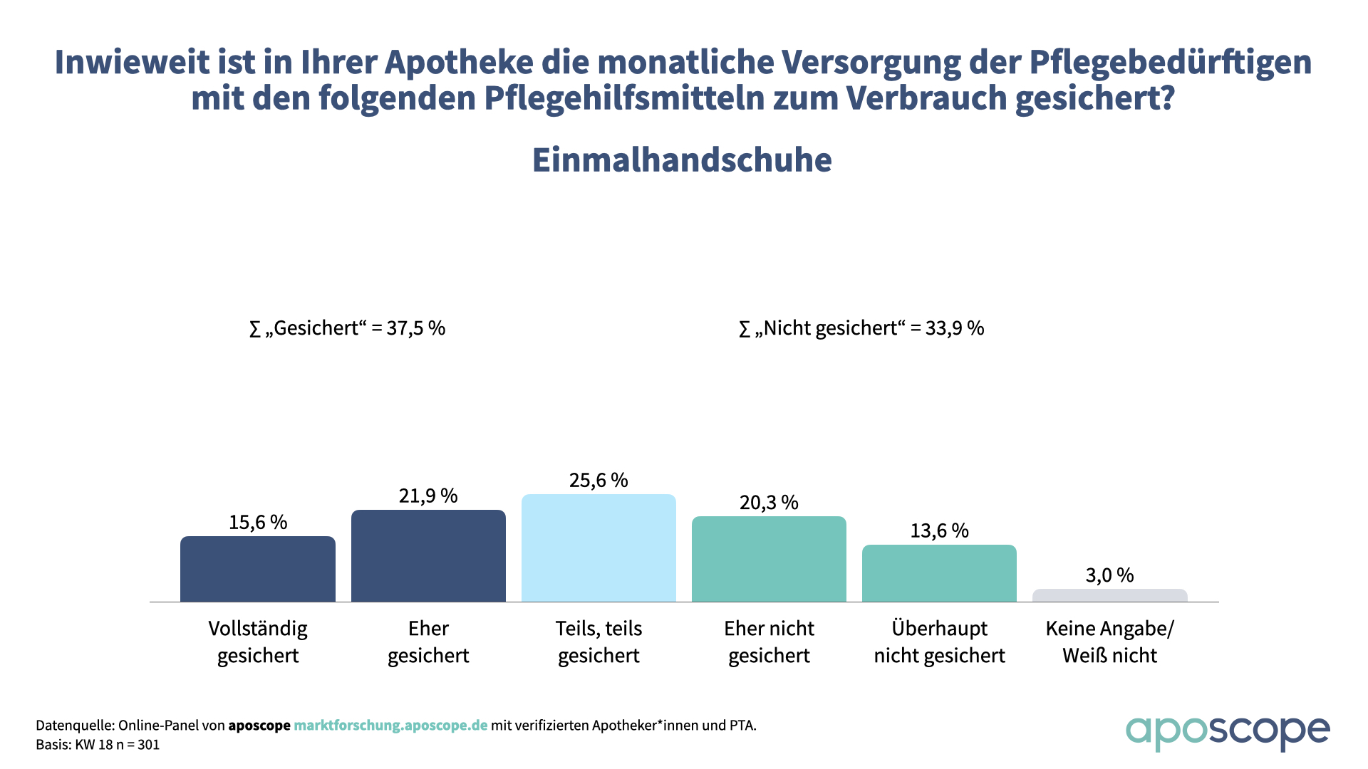 Derzeit wird über eine höhere Kassenpauschale für Pflegehilfsmittel diskutiert, die Pflegende benötigen, um betroffene Angehörige zu Hause zu pflegen. Dazu gehören Produkte wie Betteinlagen, Einmalhandschuhe, sowie Desinfektionsmittel und Schutzmasken, die aktuell zum Teil verstärkt nachgefragt werden. Während die Versorgung mit entsprechenden Produkten bis auf Einmalhandschuhe in den Apotheken überwiegend gesichert ist, ist mit Ausnahme von Betteinlagen bei allen Pflegehilfsmitteln ein Anstieg des Einkaufspreises festzustellen.