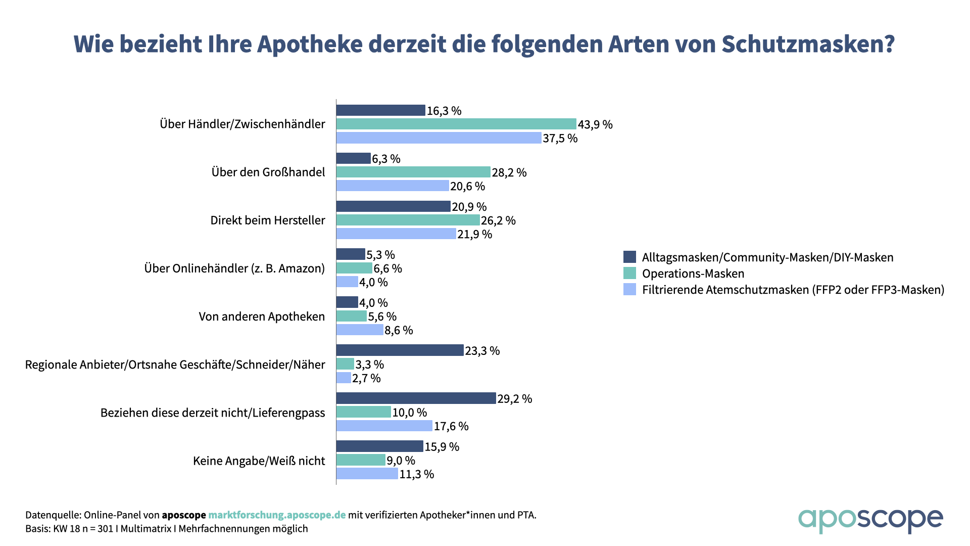 Sowohl Filtrierende Masken als auch OP-Masken bezieht das Apothekenpersonal dabei vor allem über Händler oder Zwischenhändler (38 Prozent und 44 Prozent). Aber auch der Großhandel sowie der direkte Bezug vom Hersteller spielen bei rund jedem Vierten (OP-Masken) beziehungsweise jedem fünften Befragten (FFP2 und FFP3) eine Rolle.