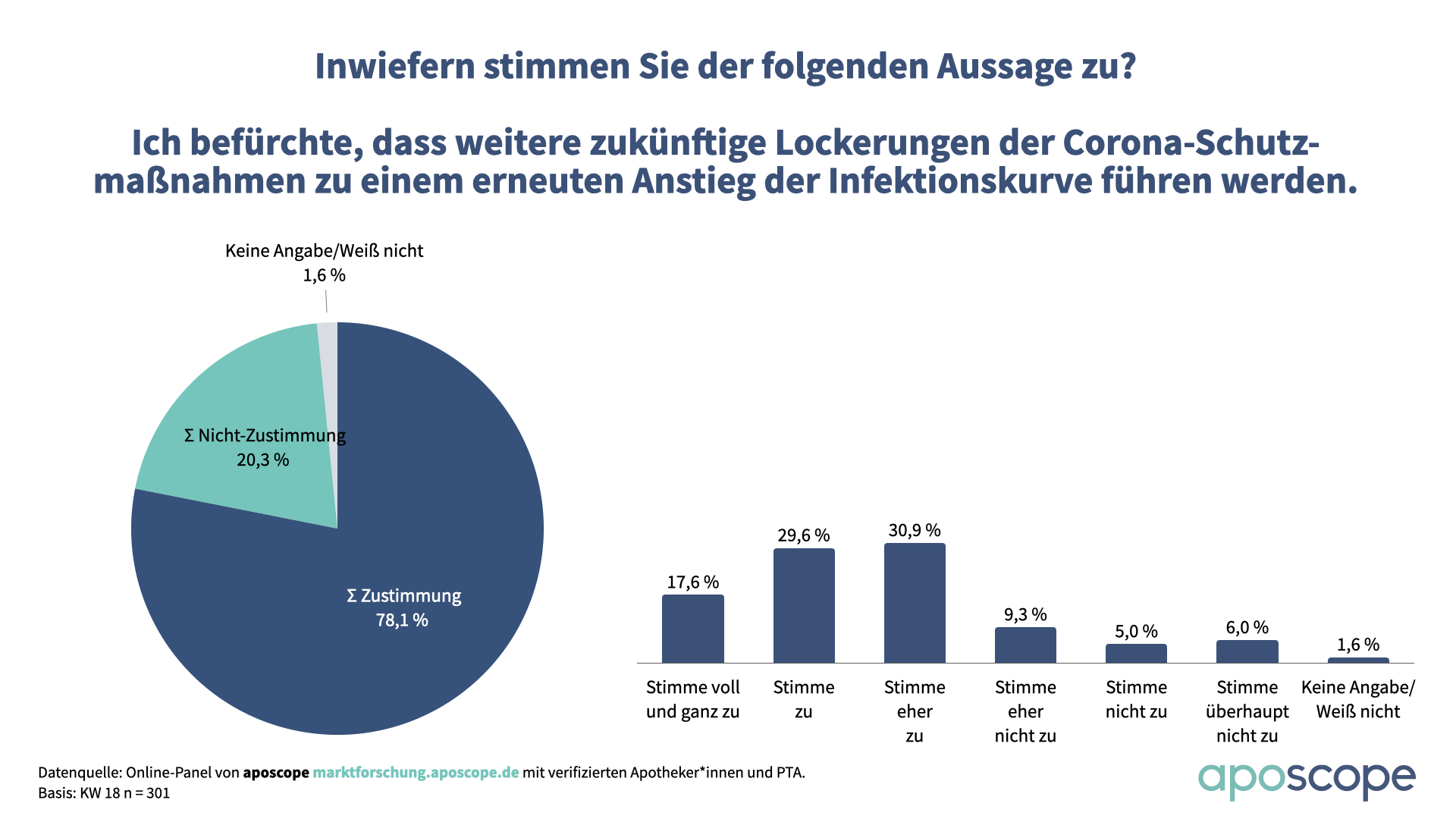 Seit Beginn vergangener Woche sind erste Lockerungen der Corona-Regelungen in Kraft, die nach wochenlanger Schließung vor allem im Einzelhandel für Aufatmen gesorgt haben. Sowohl die Bundesregierung als auch Virologen haben jedoch eindringlich davor gewarnt, dass durch diesen ersten Schritt zurück in die Normalität die Zahl der Corona-Erkrankungen wieder steigen könnte. Diese Sorge teilen knapp drei Viertel der Umfrageteilnehmer. Sollte es demnächst noch weitere Lockerungen geben, ist die Besorgnis beim Apothekenpersonal sogar noch etwas größer (78 Prozent).