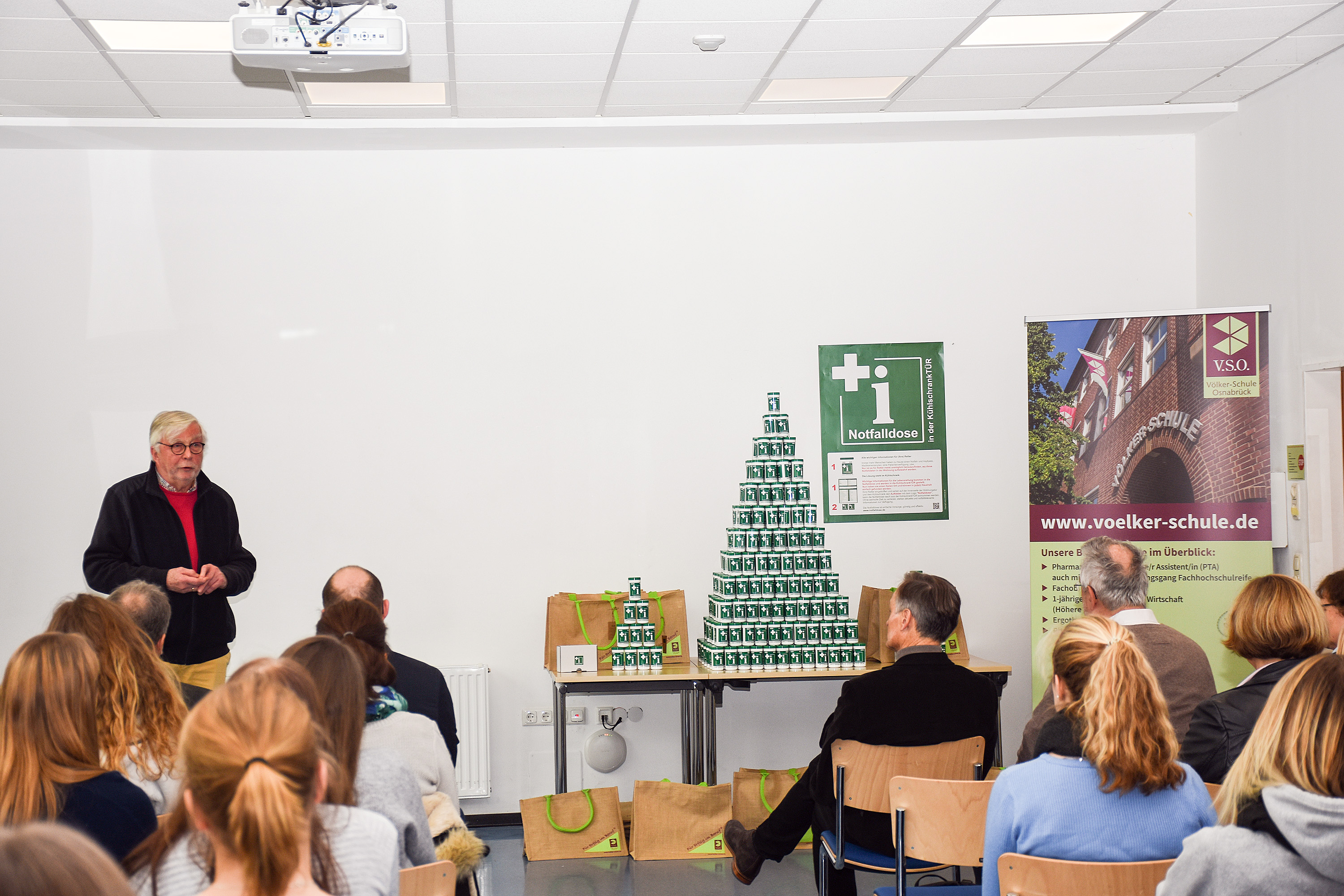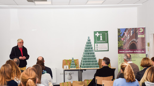 Apotheker und Rettungsmediziner haben PTA-Schülern die Notfalldose vorgestellt. An der Osnabrücker Völker-Schule wurden 700 Stück an Schüler und Lehrer verteilt. Der grüne Behälter soll für Rettungsdienste Informationen über Medikamente, Allergien oder Vorerkrankungen enthalten.