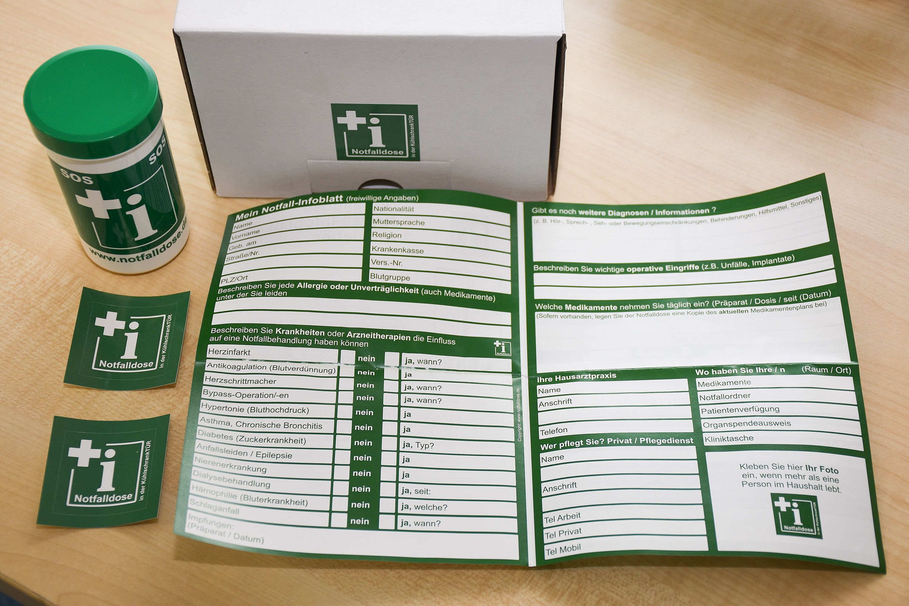 Die Dose enthält ein Formular mit den Notfalldaten. Zum besseren Finden der Box soll auf der Innenseite der Wohnungstür sowie auf der Kühlschranktür der Sticker „Notfalldose“ geklebt werden. „Verbreiten und kommunizieren Sie bitte dieses wichtige Instrument zum Retten von Leben“, sagte Schulleiter Burkhard Pölzing. „Es wäre schön, wenn diese Idee auch in anderen Städten Nachahmer findet.“