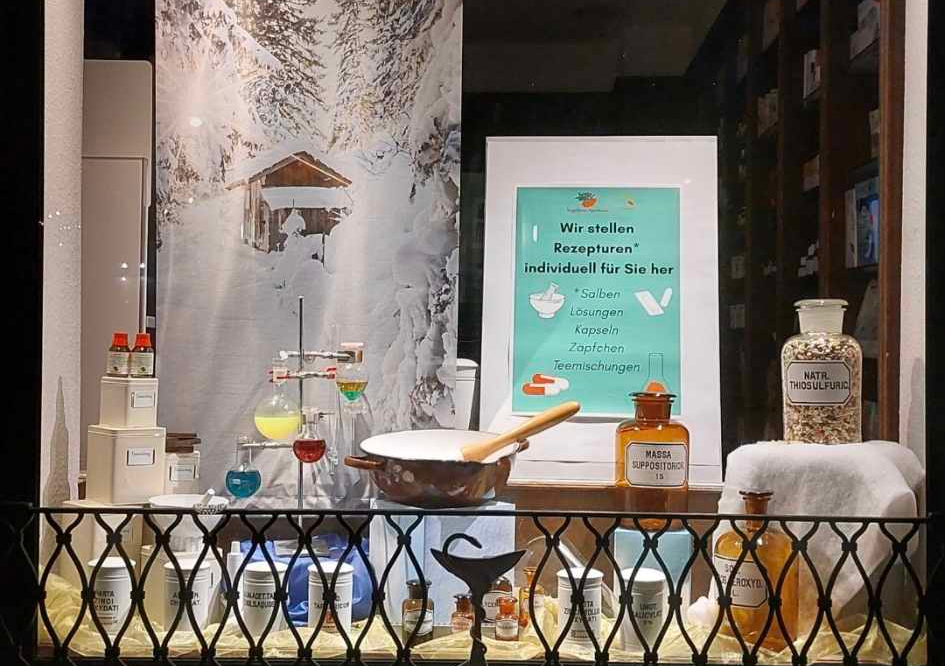 Nach der Weihnachts- und Winterzeit wollte sie in das Schaufenster neuen Schwung bringen. „Ich wollte mal was anderes, etwas außergewöhnliches“, sagt die 47-Jährige. Sie entschloss sich, für ihr Spezialgebiet zu werben: „Wir stellen Rezepturen individuell für Sie her“, heißt es jetzt auf einem Aushang. Dazu sind verschiedene Substanzen und Behälter, Stößel und bunt gefüllte Gläser abgebildet.