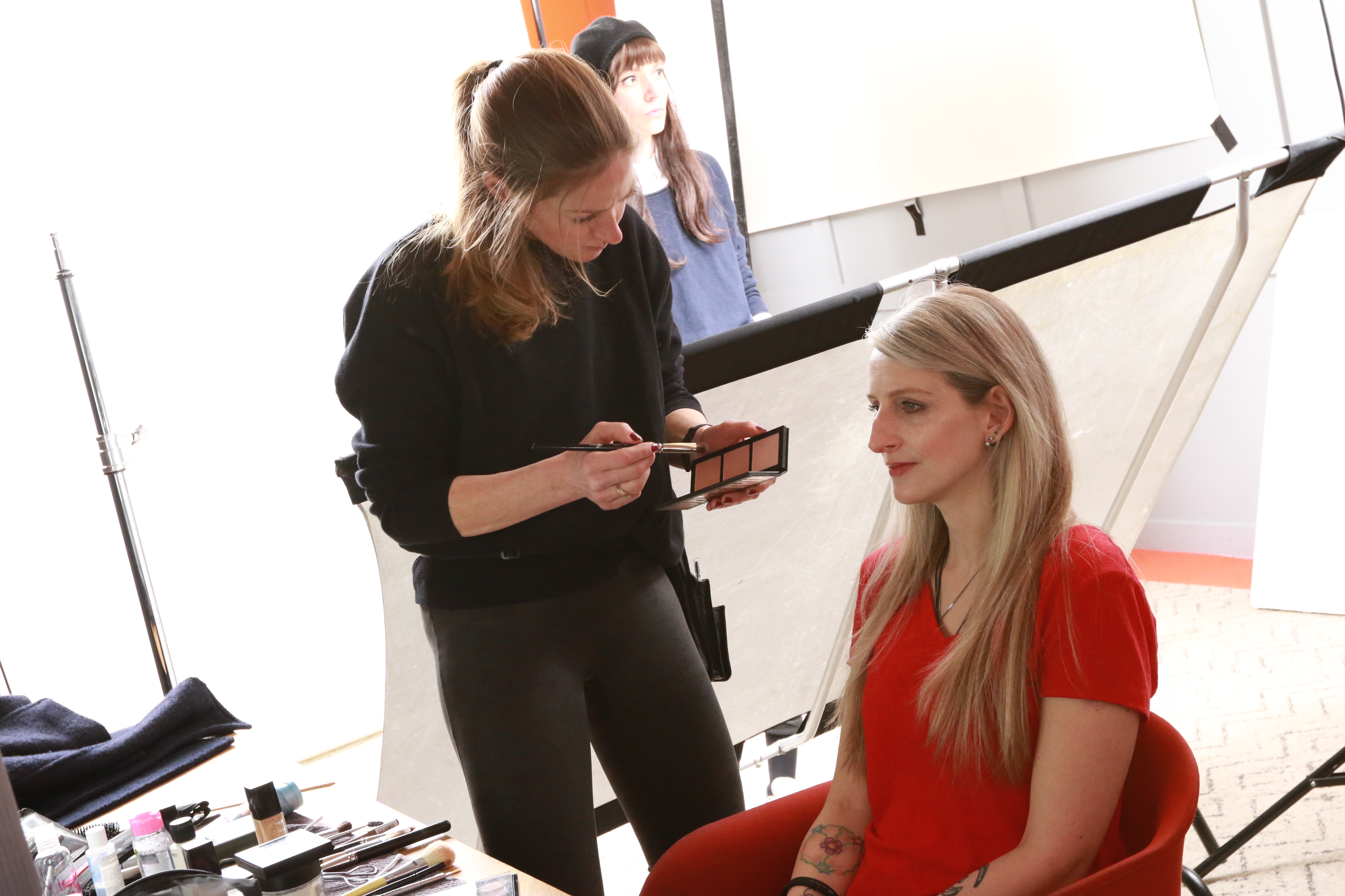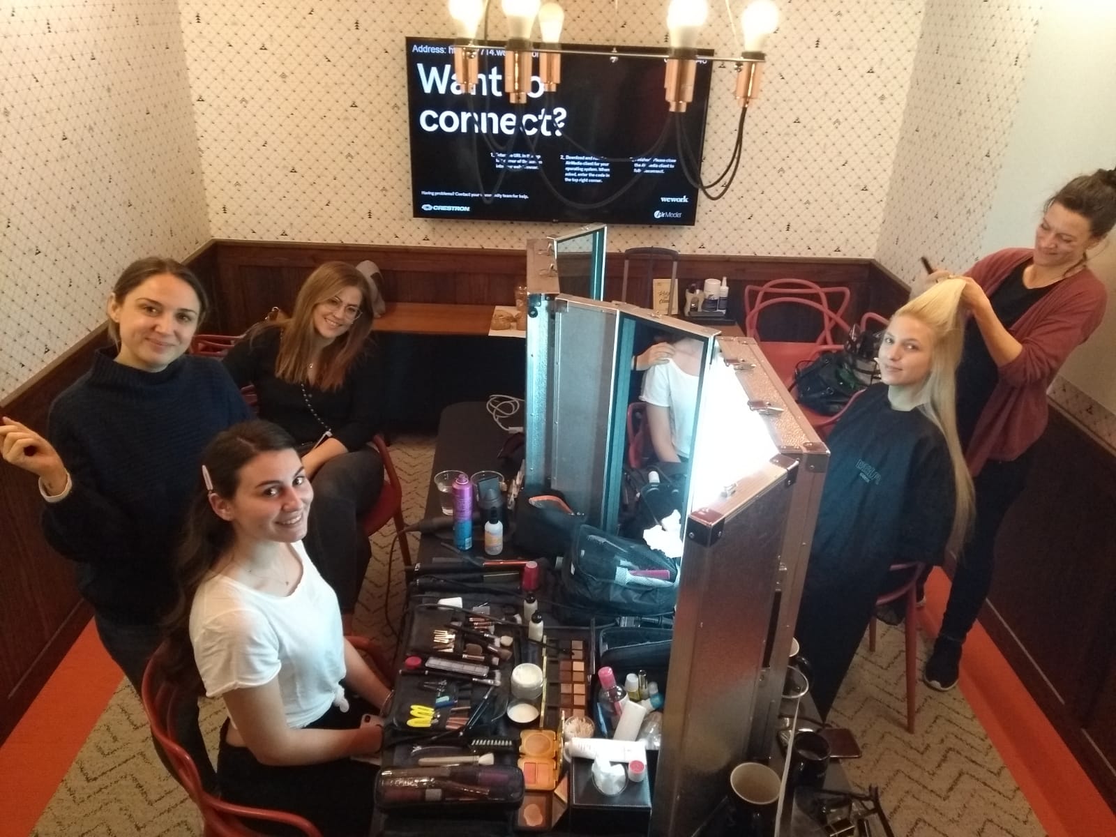 Vor großen beleuchteten Spiegeln verwandelten die Stylistinnen die PTA in glamouröse Covergirls. Die Frauen waren von dem Ergebnis begeistert und genossen das Schminken und Frisieren: Rouge wurde auf Wangen verteilt, Lipgloss aufgetragen und Haare geflochten. „Darf ich auch Glitzer haben?“, fragte Linda und die Stylistin griff zum Glitzerpuder. „Wow, deine Haare sehen super aus“, lobte Dorotea die langen Locken von Blerta.