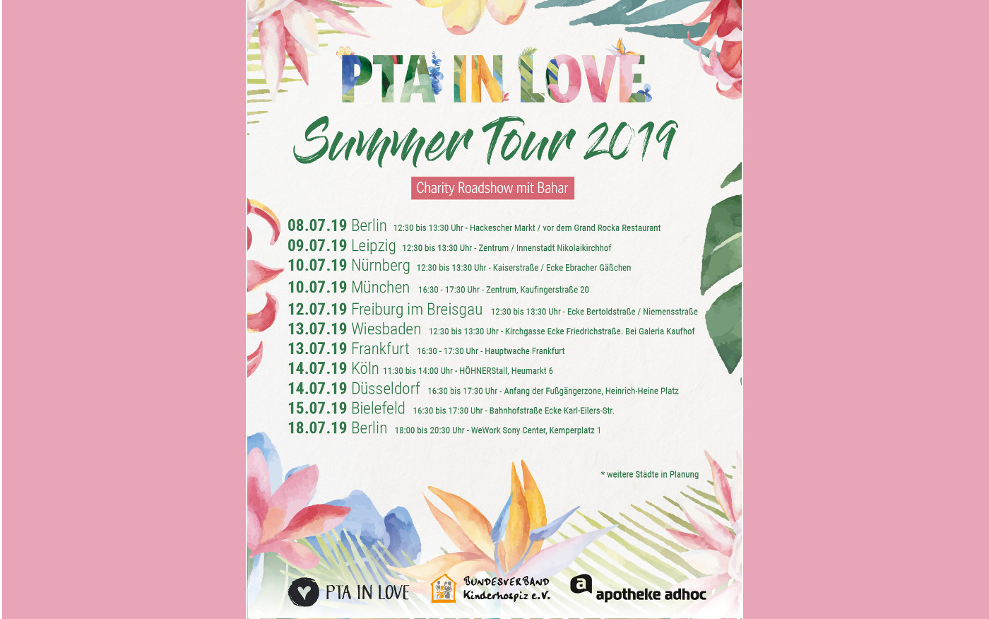 PTA IN LOVE und APOTHEKE ADHOC versetzen Deutschlands Großstädte in Sommerlaune: Die Sängerin Bahar Kizil singt auf der „Summer Tour“ in zehn Zentren für einen guten Zweck. Heute begann die Charity-Roadshow in Berlin. Mit den Straßenkonzerten wird auf eine Aktion des Bundesverbands Kinderhospiz aufmerksam gemacht.