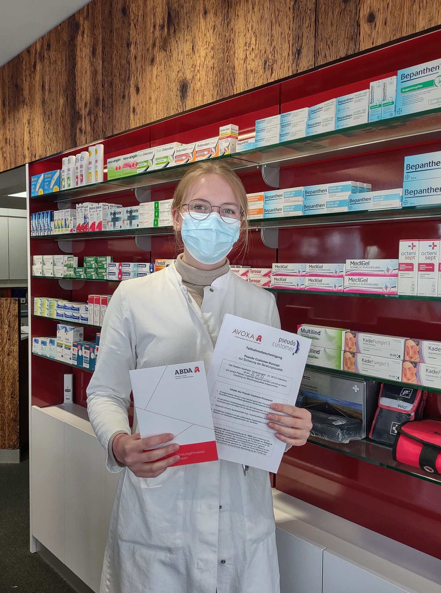 Apothekerin Dr. Gabriele Röscheisen-Pfeifer hat ein gutes Gespür für kompetente Mitarbeiter:innen. Sie überzeugte die PTA-Absolventin Marlene Onken nach dem Praktikum bei ihr in der Dobben-Apotheke zu arbeiten. Die junge PTA bestand jetzt mit zwei Monaten Berufserfahrung ihren ersten Testkauf.