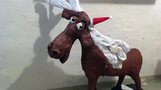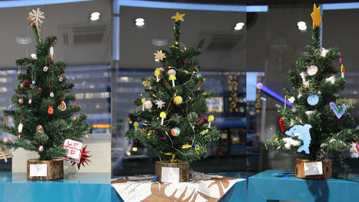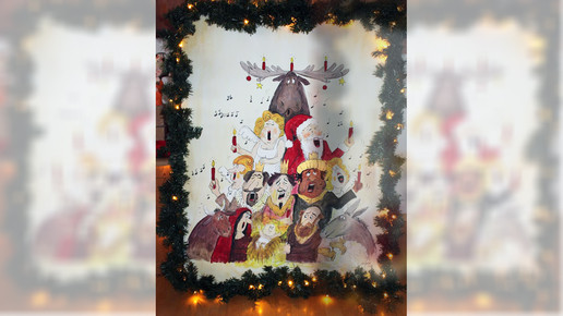 In diesem Jahr setzt Gräve-Lütticke auf zahlreiche Weihnachtsfiguren: Für ihren ehemaligen Chef, Apotheker Dr. Gerd Franke, malte sie einen Christbaum der besonderen Art: Ganz unten singen Maria und Josef sowie die Tiere aus der Krippe mit dem Jesuskind, darüber sind die trällernden heiligen drei Könige mit Engeln, darüber der Weihnachtsmann und das Christkind – über allen spitzt ein Elch die Lippen. Umrahmt ist das Gemälde von einer Lichtergirlande.