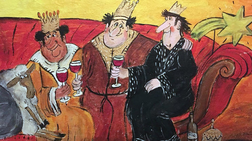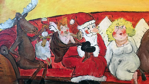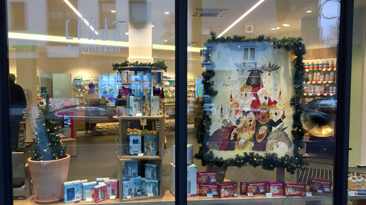 Die etwa einen Meter hohe Leinwand stelle die Weihnachtsfiguren „leicht karikaturmäßig“ dar, so die PTA. Das Bild hängt im Schaufenster, daneben steht ein beleuchteter Weihnachtsbaum. „Schaufenster dürfen extravagant sein“, betont Gräve-Lütticke, die nicht mehr als PTA arbeitet. „Ich versuche, keine 08/15-Dekoration zu machen.“ Zu Weihnachten zeichnete sie bereits Christkind und Nikolaus, die sich verliebt auf einem Sofa anhimmeln, ließ die heiligen drei Könige mit Rotwein anstoßen und kreierte Weihnachtselche aus Pappmaché.