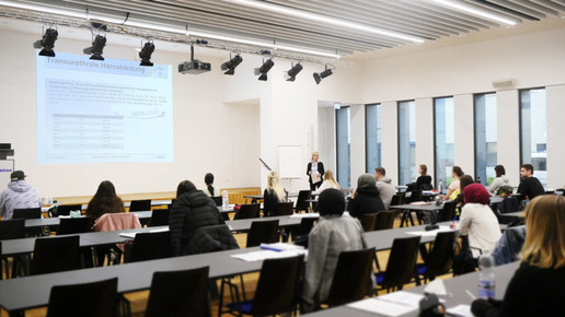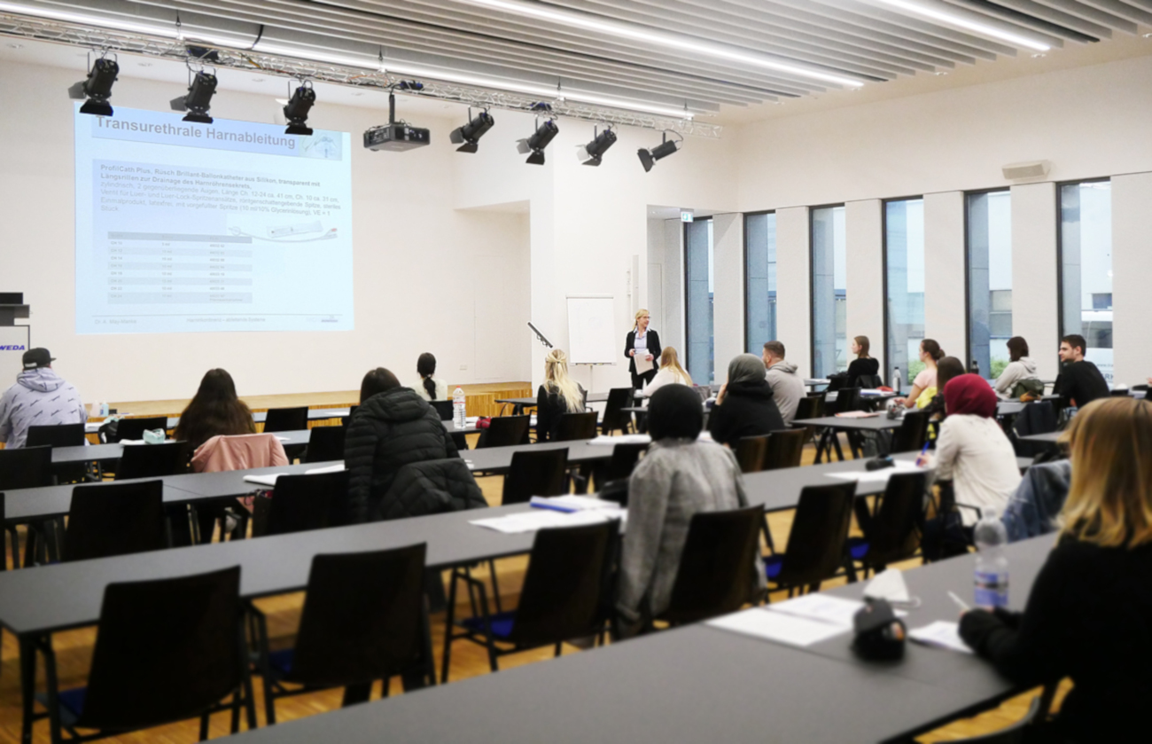 Damit der Unterricht ordnungsgemäß stattfinden kann, stellt Noweda der PTA-Schule aktuell Räumlichkeiten in der Zentrale in Essen zur Verfügung. Im Seminarbereich mit einem 353 Quadratmeter großen Saal können die notwendigen Sicherheitsabstände problemlos eingehalten werden.