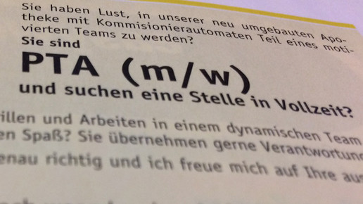 „Lust auf was Neues?“, fragt die Apotheke im brandenburgischen Schwedt auf ihrer Facebook-Seite. „Wir brauchen Verstärkung in unserer Apotheke und suchen motivierte, kommunikative und allzeit gut gelaunte PKA/PTAs in Voll- oder Teilzeit.“ Im dazugehörigen Bild markiert eine rote Pin-Nadel extra den 31. – Jahresende, Kündigungsfrist.