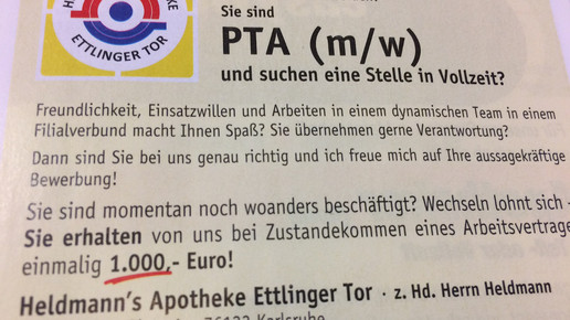 „Sie erhalten von uns bei Zustandekommen eines Arbeitsvertrages einmalig 1000 Euro“, war in der Stellenanzeige zu lesen. Bei den Kollegen werde er mit seiner Wechselprämie keine Sympathien finden, war sich der Apotheker sicher. Dennoch lasse der vorherrschende Fachkräftemangel beinahe keine andere Wahl.