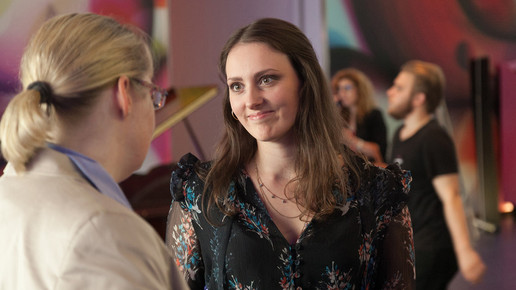 Zwei Tage arbeiteten Nicole Klimmeck, Elena Arabova, Linda Sahmel, Claudia Lippert und Alina Michel an ihren Liedern, das sie gemeinsam mit Nik Hafemann für den Workshop ausgesucht hatten. Das Ziel: Anhand eines Songs erkundeten die vier PTA und Apothekerin Elena Arabova das Handwerk, bekamen einen ersten Einblick in ein Metier, das sich von ihrem Arbeitsalltag in der Offizin komplett unterscheidet. Es war ein Crashkurs des Musikbusiness, jede Minute war kostbar. Alle wollten nur zwei Dinge: lernen und singen. Elena war beeindruckt: „Ich habe noch nie vor Publikum gesungen, singe eigentlich nur für mich, zu Hause, zur Entspannung.“