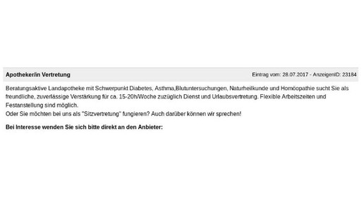 Älterer Apotheker, „alte Schule“, selbst Inhaber, länger außer Dienst, ohne EDV- und Computererfahrung aber fit, „sitzt“ Ihre Vertretung aus. Diese Anzeige konnte man in den Stellenangeboten eines Standesmediums vor wenigen Wochen lesen. Für seine Dienste wollte der Kollege 600 Euro für eine 42 Stundenwoche und eine kostenfreie Unterkunft haben.
