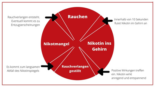 Nimmt ein Raucher/eine Raucherin längere Zeit kein Nikotin zu sich, kann der Körper mit Entzugserscheinungen reagieren. Durch Rauchen flutet das Nikotin innerhalb weniger Sekunden im Gehirn an – die Folge sind vermeintlich positive Wirkungen: Die Betroffenen fühlen sich entspannt und der Suchtdruck ist gestillt. Danach fällt der Nikotinspiegel langsam wieder ab, bis sich erneutes Verlangen einstellt. Der Suchtkreislauf entsteht – und muss durchbrochen werden, um Erfolg beim Rauchstopp zu erzielen.