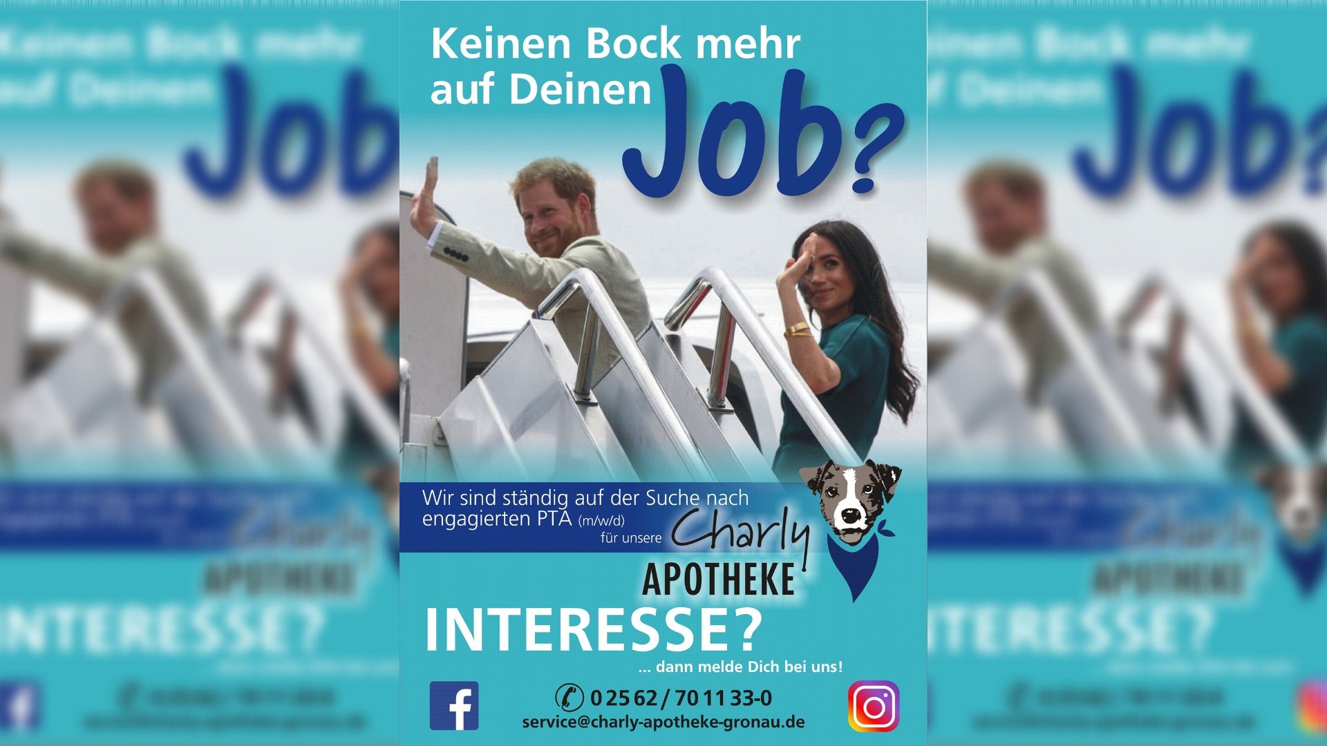 Mit der großen Überschrift „Keinen Bock mehr auf deinen Job?“ und einem Bild der britischen Royals Prinz Harry und Herzogin Meghan machen die Inhaber der Charly-Apotheke auf ihr Jobangebot aufmerksam. In Anspielung auf den Rückzug der beiden aus der britischen Adelsfamilie suchen die beiden Brüder mit einem humoristischen Aufruf nach PTA.
